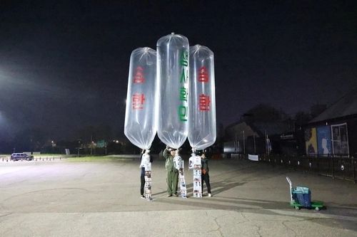 납북자가족모임이 27일 0시20분쯤 파주시 문산읍 임진각 평화랜드 펜스 뒤편에서 대북 전단 8개를 북측을 향해 날려 보낼 준비를 하고 있다. (납북자가족모임 제공) |