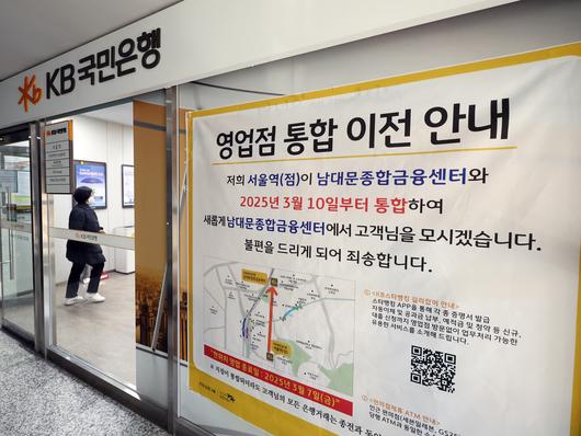 서울의 한 KB국민은행 영업점에 통합 이전 안내문이 붙어있다. /뉴스1 |