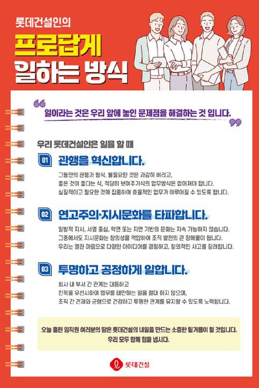 [아이뉴스24 이수현 기자] 롯데건설은 2025년 경영방침 중 의식전환을 실천하기 위한 캠페인으로 '프로답게 캠페인'을 시행 중이라고 28일 밝혔다.