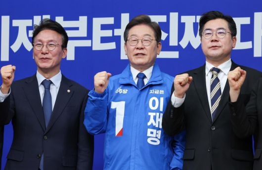 이재명 더불어민주당 대선 후보(가운데), 박찬대 대표 직무대행 겸 원내대표(오른쪽), 김민석 최고위원이 28일 서울 여의도 국회에서 열린 최고위원회의에서 파이팅을 외치며 기념 촬영하고 있다. 2025.4.28/뉴스1 ⓒ News1 |