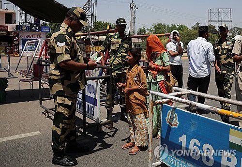 인도 파키스탄 국경27일 인도 펀자브주 암리차르 인근 국경에서 인도 국경경비대가 인도를 떠나려는 파키스탄인들의 여권을 검사하고 있다. [로이터 연합뉴스 자료사진. 재판매 및 DB 금지]