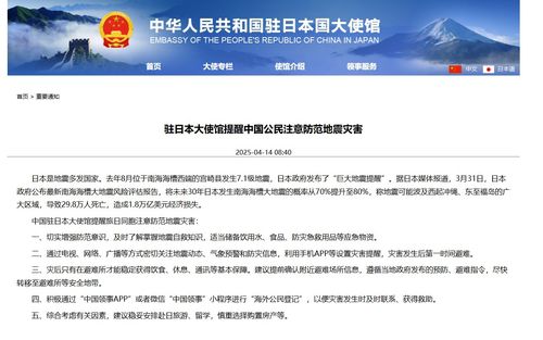 중국대사관 측은 이런 내용을 소개한 뒤 비상식량 비축, 재해 발생 시 조기 대피 등 일반적인 주의 사항을 열거하면서 "일본 여행이나 유학에 대해서는 신중하게 계획하고 부동산 구입도 신중하게 선택할 것을 권한다"라고 밝혔습니다.