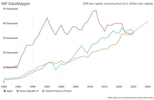 국제통화기금(IMF)이 한국의 1인당 국내총생산(GDP)이 내년이면 대만에 역전당할 것으로 전망했다. 내수 회복이 지연되고 관세 전쟁이 본격화되면서 성장률이 낮아지면서 1인당 지디피 4만달러 돌파 시점도 2027년에서 2029년으로 밀린 것으로 나타났다. 윤석열 전 대통령은 지난해 한 국정브리핑에서 한국이 일본의 1인당 지디피를 추월한 점을 최대 경제 성과 중 하나로 꼽은 바 있다.