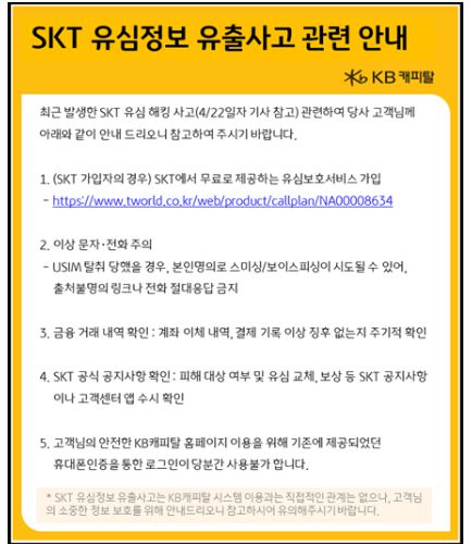 또한, 카드사들도 일제히 홈페이지에 'SK텔레콤 휴대폰 이용자 피해 예방 수칙 안내'를 설명했습니다.
