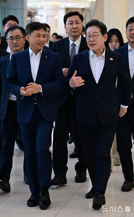 [서울=뉴시스]이현주 기자 = 곽노정 SK하이닉스 대표이사 사장이 이재명 더불어민주당 대선 후보를 만나 국가 차원의 반도체 산업 지원을 요청했다.