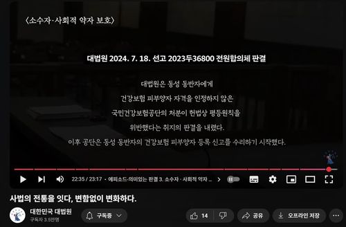 (서울=연합뉴스) 황윤기 기자 = 조희대 대법원장 취임 후 동성애자와 장애인 등 소수자 권리 보장에 이바지했다는 평가를 받는 전원합의체 판결이 법원 홍보 영상에 대표 판결로 소개됐다.