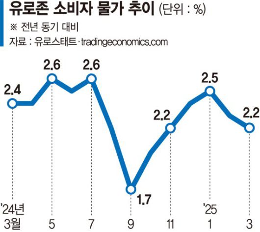 유로존의 물가상승 압력이 완화되면서 시장에서는 ECB가 연내 몇 차례 추가로 금리를 내릴 것으로 기대하고 있다. ABN암로의 거시경제 연구이사 빌 다바이니는 유로존에서 임금 상승 압력이 완화되면서 디스인플레이션 가능성이 커져 9월이면 금리가 1.5%로 내려갈 것으로 예상했다. BofA는 또 관세에 따른 불확실성과 유로화 강세, 글로벌 수요 둔화로 올해 유로존 전체 국내총생산(GDP) 성장률 전망치를 0.8%, 내년은 1.0%로 하향 조정했다.