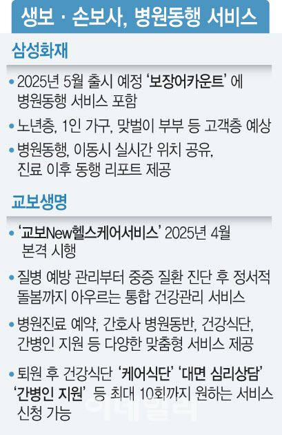 손보업계 1위 삼성화재는 5월 출시할 혁신상품 ‘보장어카운트’에 병원동행 서비스를 포함할 예정이다. 삼성화재는 도와줄 사람이 없는 1인 가구와 복잡한 병원 절차를 혼자 해결하기 어려운 노년층 부모님, 자녀가 아픈데 직장에 가야 하는 맞벌이 부부 등을 위해 병원동행 서비스를 강화하겠단 구상이다. 병원동행 서비스에선 가족을 대신해 병원 진료를 신청하고, 병원으로 이동할 때 위치 정보를 실시간 가족에게 공유한다. 또 병원 진료가 끝난 후엔 결과에 대한 리포트까지 정리해 고객에게 제공할 예정이다.