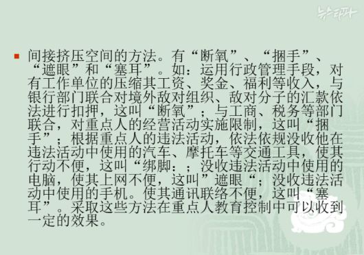 아드리안 젠즈가 제공한 자료에 따르면, 중국은 이러한 초국가적 탄압을 구체화하기 위한 다양한 전술을 활용한다. 대표적으로 관리 대상의 중국 내 은행 계좌 동결, 인터넷 활동 모니터링 및 관리 등이 있다. 또 보다 많은 반체제 인사를 신속하게 파악하고 조치하기 위해 컴퓨터나 스마트기기 해킹 기술을 사용하기도 한다.