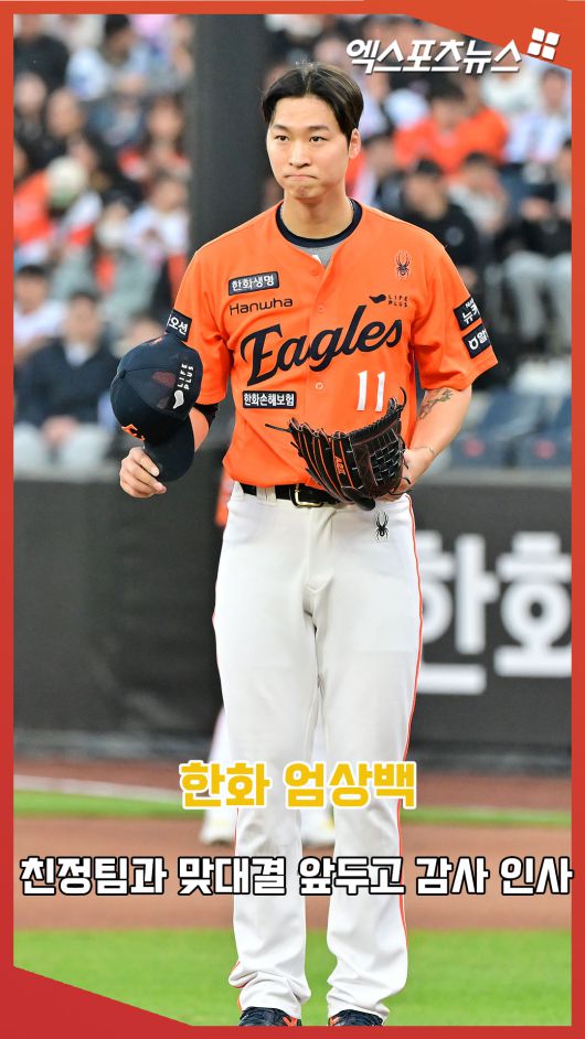 (엑스포츠뉴스 대전, 김한준 기자) 25일 오후 대전 한화생명 볼파크에서 열린 '2025 신한 SOL Bank KBO리그' KT 위즈와 한화 이글스의 경기, 경기 전 한화 선발투수 엄상백이 KT 더그아웃 및 관중석을 향해 인사를 하고 있다.김한준 기자 kowel@xportsnews.com