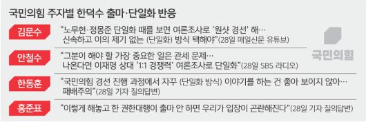 후보들에게 공약이나 이 후보와의 경쟁력보다 한 권한대행과의 단일화 입장 및 방식이 더 중요한 의제가 됐다. 이로 인해 보수진영 대표 정당인 국민의힘 경선 과정이 당의 노선이나 가치, 철학을 둘러싼 논쟁이 아닌 정치공학만 난무하게 됐다는 지적이 나온다. 다음 달 3일 국민의힘 후보가 선출될 가능성이 높은 가운데, 한 권한대행이 출마할 경우 ‘단일화’ 과정도 촉박하게 진행될 것이라는 관측이 제기된다.