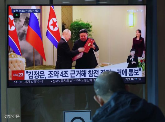 북 “전략적 동반자 관계 조약에 따라 파병” 북한이 러시아 파병을 공식 확인한 28일 서울역 대합실에서 한 시민이 관련 뉴스를 보고 있다. 한수빈 기자 subinhann@kyunghyang.com |