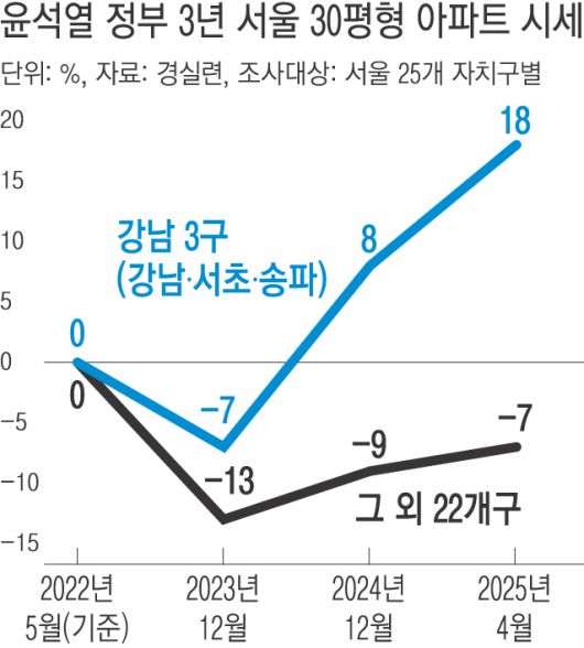 윤석열 정부 3년 동안 강남 3구(강남·서초·송파구) 주요 대단지 평당 가격이 평균 18% 오른 것으로 나타났다. 강남 3구 이외의 서울 22개 자치구는 7% 떨어졌다. 재건축 활성화, 정책금융 확대 등 정부의 부동산 정책이 ‘강남 쏠림’ 현상을 가속화했다는 비판이 나온다.