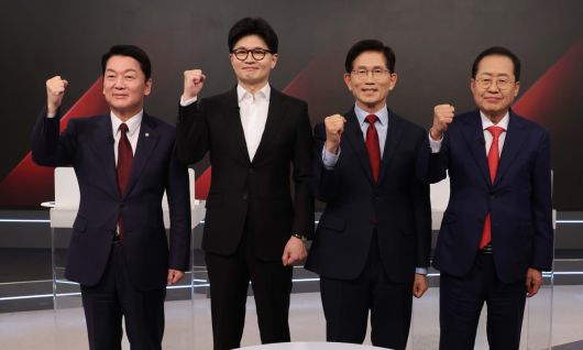 김문수(왼쪽부터), 안철수, 한동훈, 홍준표 제21대 대통령 선거 국민의힘 경선 후보가 23일 오후 서울 여의도 국민의힘 중앙당사에서 열린 2차 경선토론회 미디어데이에서 기념촬영을 하고 있다. 국회사진기자단 |