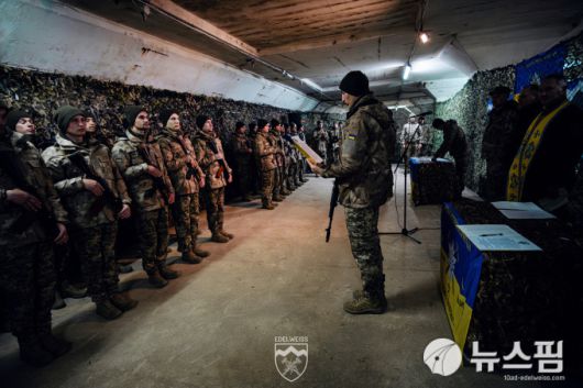 [콜로미야 로이터=뉴스핌] 장일현 특파원 = 지난 8일(현지시간) 우크라이나군 제10 에델바이스 분리산악공격여단 신병들이 서부 콜로미야 지역의 장소가 공개되지 않은 곳에서 열린 선서식에 참석했다. 우크라이나군은 18~24세의 신병들에게 약 2만4000달러 상당의 연봉과 보너스를 제공하고 있다. ihjang67@newspim.com |