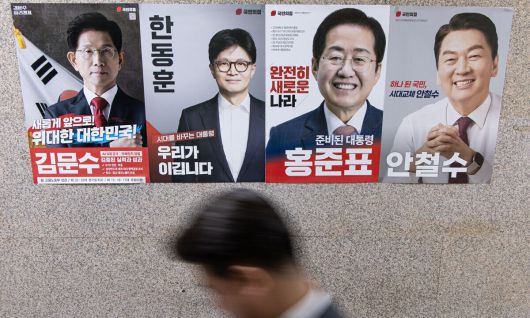 지난 23일 오전 서울 여의도 국회에 국민의힘 1차 컷오프를 통과한 김문수(왼쪽부터), 한동훈, 홍준표, 안철수 후보 포스터가 붙어 있다. 뉴스1 |