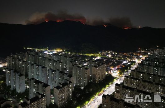 [대구=뉴시스] 김정화 기자 = 국가 소방동원령이 발령된 대구 북구 함지산 산불의 진화율이 47%로 집계됐다.