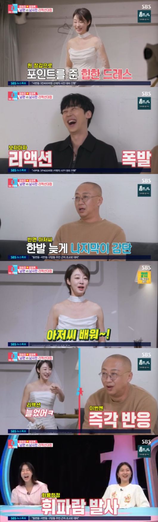 업무 통화를 위해 잠시 자리를 비웠던 김재욱은 뒤늦게 최여진의 웨딩드레스 자태를 본 김재욱은 기계적인 리액션을 날렸다. 반면 윤종훈은 리액션의 정석을 보여줬고, 이에 김재욱은 최여진이 드레스를 입고 나올 때마다 휘파람을 발사하는 등 과한(?) 리액션으로 웃음을 줬다.