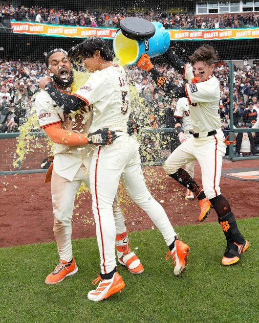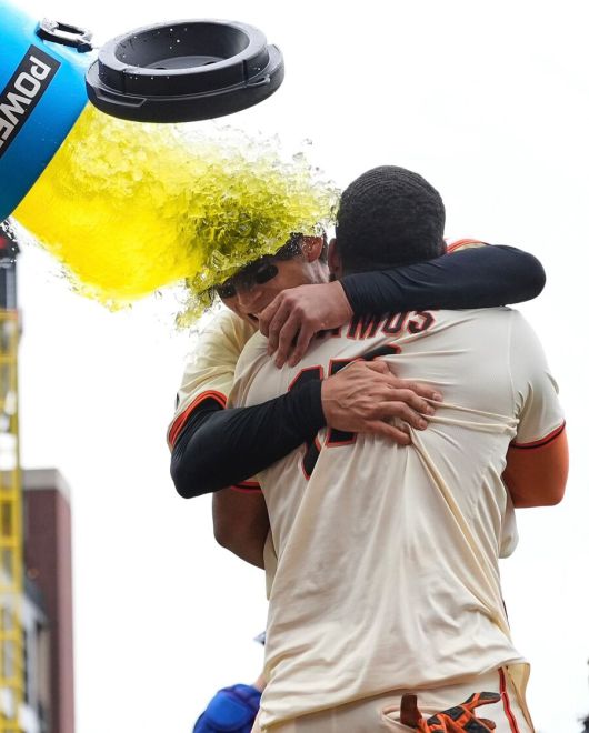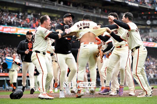 그런데 이정후(27·샌프란시스코)의 속도가 늦었던 것일까. 이정후는 다른 선수들에 비해 홈에 도착했고, 하필 그때 다른 동료는 ‘게토레이 샤워’를 준비 중이었다. 이정후를 겨냥한 샤워는 아니었으나 그 시점에 이정후가 라모스를 단독으로 축하해주고 있던 까닭에 라모스와 이정후가 모두 물세례를 받았다. 타이밍이 좋지 않아(?) 봉변을 당한 셈이었지만, 모든 사진에 라모스와 이정후가 투샷을 받았다. 그래도 기분이 나쁘지 않은 물세례였다.