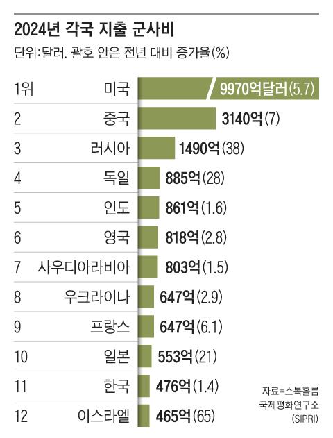 28일 스웨덴의 군사정보 연구기관 스톡홀름국제평화연구소(SIPRI)가 공개한 ‘2024년 세계 군사비 현황’에 따르면 세계 최대 군사비 지출 국가인 미국을 비롯해 중국·러시아·독일·인도·영국·사우디아라비아·우크라이나·프랑스·독일 등 상위 10국이 모두 전년보다 군사비를 늘렸다. 미국이 5.7% 늘어난 9970억달러로 전 세계 군사비 지출의 37%를 차지했다. 중국은 전년보다 7% 상승했고, 우크라이나와 전쟁 중인 러시아의 군사비 지출은 1490억달러로 전년 대비 38% 급증했다.
