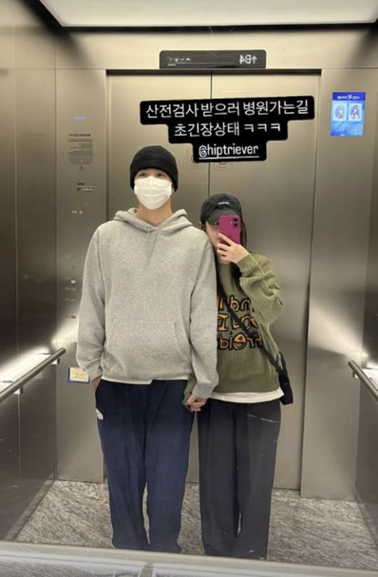 공개된 사진 속 미미는 천둥과 손을 꼭 잡고 엘리베이터에 탑승한 모습. 거울을 바라보고 있는 천둥과, 거울 셀카를 찍고 있는 미미의 투샷이 눈길을 끈다. 특히 천둥은 산전검사를 앞두고 긴장한 듯한 자세로 이목을 집중시킨다.