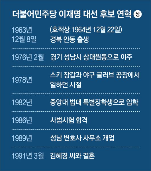 1976년 초교를 졸업한 직후 아버지가 정착한 경기 성남시 상대원동 꼭대기 월셋집으로 온 가족이 상경했다. 이후 이 후보는 6년간 목걸이 공장을 거쳐 고무부품 공장, 냉장고 공장 등을 전전했다. 아버지는 동네 쓰레기를 치웠고 어머니는 상대원시장 화장실 입구에서 소변 10원, 대변 20원의 이용료를 받고 청소를 했다. 아버지는 자식 공부보다 번듯한 집 한 채 마련이 우선인 사람이었다.
