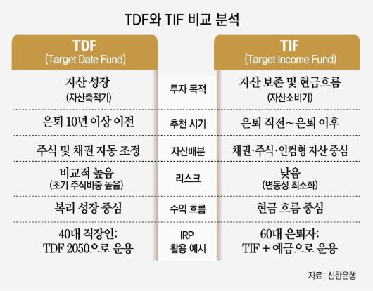 많은 투자자들이 자산배분이 중요한 건 알지만, 실제 언제, 어떠한 자산에 투자해야 하는지에 대한 선택이 어렵다고 느낀다. 이럴 때 고려해 볼 수 있는 두 가지 대표적인 상품이 있다. 바로 타깃데이트펀드(TDF)와 타깃인컴펀드(TIF)다. 두 펀드 모두 IRP 운용에 적합한 자산 배분형 펀드이지만, 은퇴 전인지 은퇴 후인지에 따라 선택이 달라진다.