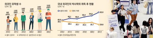 하지만 실제 정착으로 이어지는 비중은 절반도 채 되지 않는다. 특히 고급 인재일수록 이탈률은 더 높다. 한국직업능력연구원 조사를 보면 박사 학위를 취득한 외국인 유학생 중 본국으로 돌아간 비율은 2016년 40.9%에서 2021년 62.0%로 급증했다. 한국에 남는 비중은 39.1%에서 29.8%로 줄었다. 고급 두뇌들이 한국에 등을 돌리고 있는 셈이다.