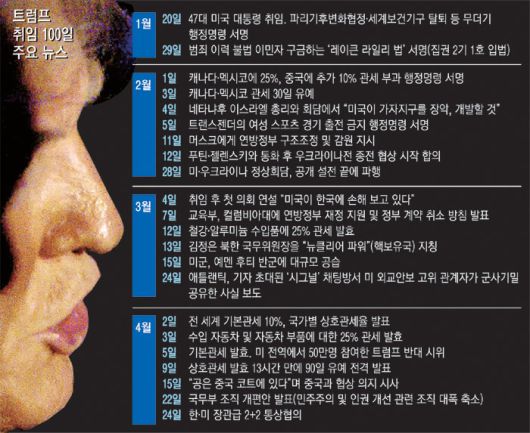트럼프 대통령이 지난 100일 동안 ‘속도전’ 방식으로 전개한 연방정부 개혁, 이민, 관세 정책에 대한 민심의 평가는 엇갈리지만, 그의 국정 지지율은 하락 추세가 뚜렷하다. 29일 취임 100일째가 되는 트럼프 대통령의 지지율은 역대 최저 수준이다. CNN과 SSRS의 조사(지난 17~24일, 미국 성인 1678명)에서도 트럼프 지지율은 41%에 그쳤는데 이는 드와이트 아이젠하워 전 대통령 이후 취임 100일차 신임 대통령 중 가장 낮은 수치였다.