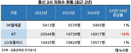 반면 같은 기간 SK텔레콤과 LG유플러스는 직원수가 오히려 각각 1%씩 증가했다. KT의 총 직원수는 현재 기준으로도 SK텔레콤 직원수 5500명의 3배인 1만7000명 수준이다. 통신 3사 각각의 내부사정이 있어 단순 비교는 어렵다.