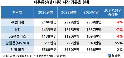 시장점유율 1위인 SK텔레콤의 이동통신 가입자수는 2020년의 2406만명에서 4년 뒤인 2024년에는 102만명 감소한 2308만명에 그쳤다. 감소율이 4%다. 같은 기간 KT는 7%, LG유플러스도 4% 감소했다. 반면 알뜰폰 사용자수는 55% 급증한 949만명을 돌파했다. 곧 1000만명을 달성할 기세다.