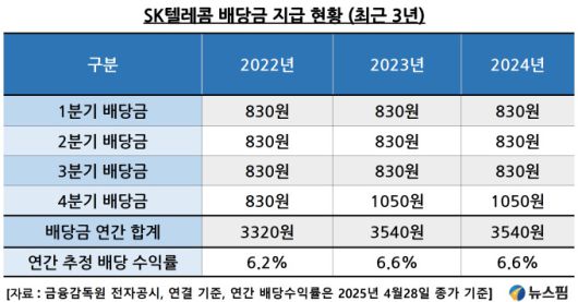 SK텔레콤은 2023년부터 배당금을 인상해 2년 연속 연간 3540원의 배당금을 지급해 왔다. 해킹 관련 우려로 주가가 폭락한 4월28일 종가인 5만3900원 기준 추정 배당수익률은 무려 6.6%에 달한다. 향후 실제 배당금 삭감 여부는 유심교체 손실비용, 과징금 등에 따라 결정될 것으로 보인다.