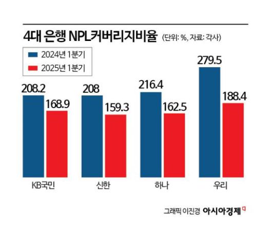 29일 금융권에 따르면 4대 시중은행(KB국민·신한·하나·우리)의 올해 1분기 부실채권(NPL·고정이하여신) 커버리지 비율은 평균(단순 합산 기준) 169.78%로 집계됐다. 최소 159.3%(신한은행)에서 최대 188.4%(우리은행)로, 4개 은행 모두 200%를 밑돌았다. 지난해 1분기 평균은 228%로, 208~279.5% 수준이었던 것을 감안하면 큰 폭의 하락세다. 지난해 말 대비로도 35.89%포인트 급락했다.