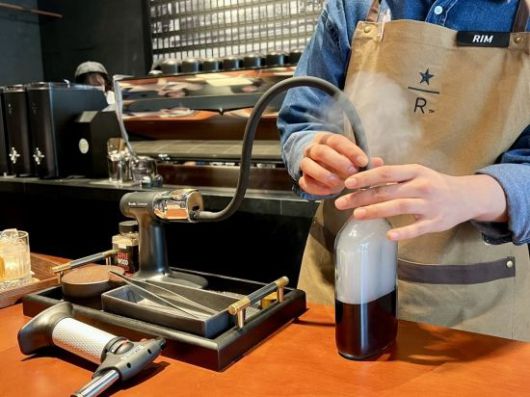 28일 찾은 스타벅스 리저브 도산. '리저브 스모크드 콜드 패션드'를 만들기 위해 스모킹건으로 훈연을 하자 매장 전체로 냄새가 퍼졌다. 한예주 기자 |