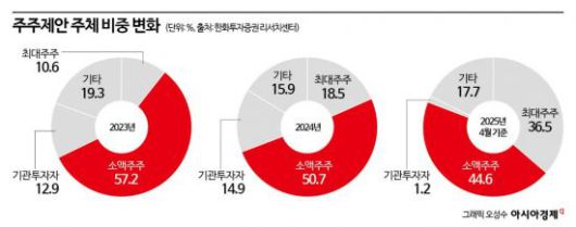 주주제안이 나온 기업 수는 전체 상장사의 2~3% 수준에 불과하지만, 내용과 주체는 과거와 크게 달랐다. 가장 큰 변화는 주주제안의 주체다. 2023년 전체 주주제안 가운데 최대주주가 제안한 비중은 10.6%에 불과했지만, 지난해 18.5%로 늘었고, 올해는 36.5%까지 급등했다.