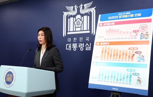 유혜미 대통령실 저출생대응수석이 지난 2월26일 서울 용산 대통령실 청사에서 2024년 합계출산율 관련 브리핑을 하고 있다. 연합뉴스 |