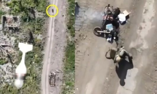 오토바이를 타고 이동 중인 러시아 병사를 상대로 우크라이나 드론이 폭탄을 떨어뜨리고 있다. 영상 캡처 |