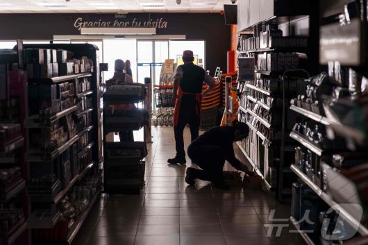 28일(현지시간) 스페인 부르고스 한 마트에서 직원들이 정전으로 인한 어둠속에서 근무를 하고 있다. ⓒ AFP=뉴스1