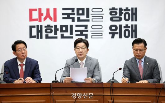 권성동 국민의힘 원내대표(가운데)가 29일 국회에서 열린 당 원내대책회의에서 발언하고 있다. 박민규 선임기자 |