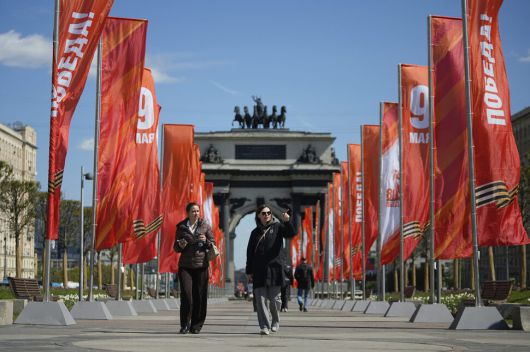 제2차 세계대전 중 소련이 나치 독일에 승리한 80주년 기념일을 앞둔 28일(현지시각) 러시아 수도 모스크바 개선문 옆 승리의 광장에 ‘5월9일’과 ‘승리’라고 적힌 깃발들이 휘날리는 가운데 사람들이 걷고 있다. AP 연합뉴스 |