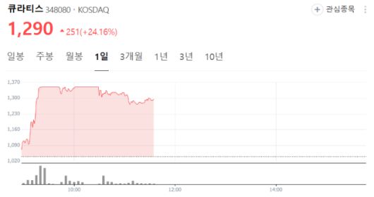 29일 큐라티스는 전일 대비 24.16% 오른 1290원, 인벤티지랩은 25.36% 상승한 3만 4725원에 거래되고 있다.