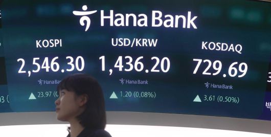 25일 오후 서울 중구 하나은행 딜링룸 전광판에 지수가 표시 되고 있다. 2025.04.25. 서울=뉴시스 |