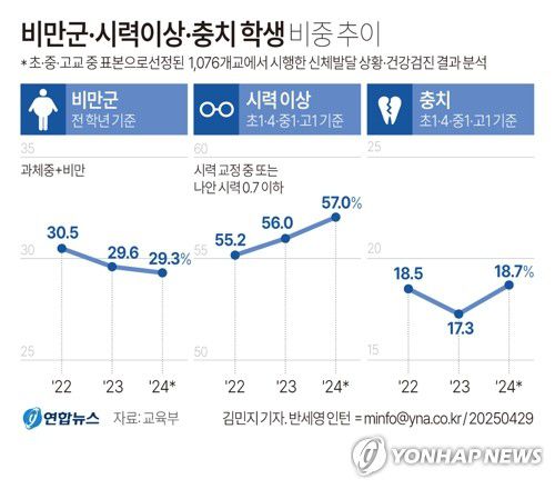 비만군(과체중+비만) 학생 비율은 29.3%로 3년 연속 감소세를 보였지만, 시력이 좋지 않거나 충치가 있는 학생 비율은 늘어났다.