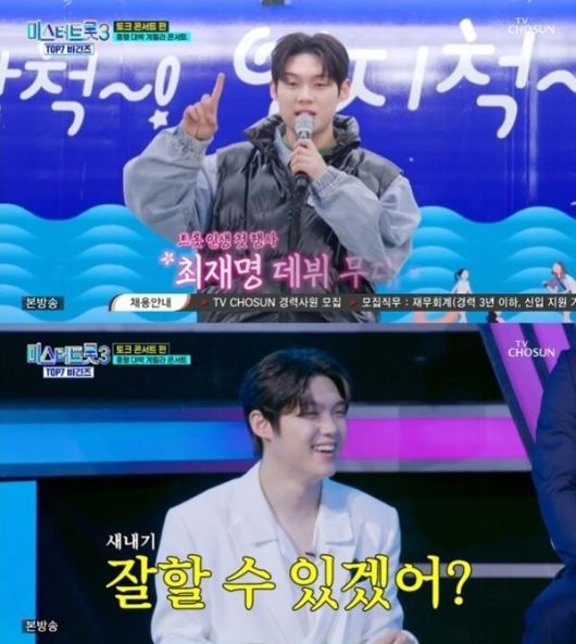최재명은 최근 방송된 TV조선 예능 프로그램 '미스터트롯3 TOP7 비긴즈'에서 첫 행사 무대에 올라 주목받았다. 지난 24일 방송에서 '미스터트롯3' TOP10은 삼척 중앙 시장에서 게릴라 콘서트를 열었고, 최재명은 "제 첫 행사입니다"라고 밝히며 김연자의 '밤열차'를 열창해 현장의 분위기를 뜨겁게 달궜다.