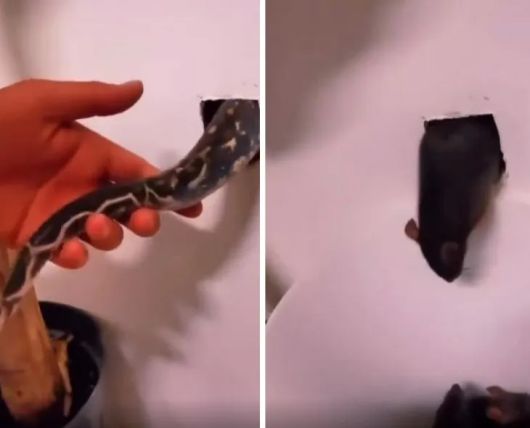벽 구멍에 애완뱀을 집어 넣자 쥐가 밖으로 나오는 모습. [타임즈나우 갈무리] |