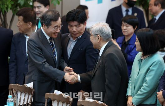 제45대 국무총리를 지낸 이낙연 새미래민주당 상임고문이 지난 17일 서울 용산구 전쟁기념관 피스앤파크컨벤션에서 열린 ‘정상국가를 향해’ 개헌연대 국민대회에서 참석자들과 인사를 나누고 있다.(사진=뉴시스) |