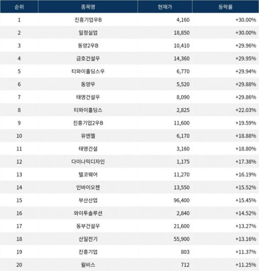 6위 동양우(001525)는 종가 5,520원으로 29.88% 상승 마감했다. 7위 태영건설우(009415)는 종가 8,090원으로 29.86% 상승 마감했다. 8위 티와이홀딩스(363280)는 종가 2,825원으로 22.03% 상승 마감했다. 9위 진흥기업2우B(002787)는 종가 11,600원으로 19.59% 상승 마감했다. 10위 유엔젤(072130)은 종가 6,170원으로 18.88% 상승 마감했다.