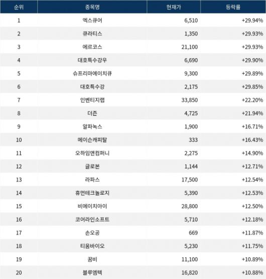 이어 상승률 2위 큐라티스(348080)는 주가가 29.93% 폭등하며 종가 1,350원에 상승 마감했다. 상승률 3위 에르코스(435570)의 주가는 21,100원으로 29.93% 폭등하며 강세를 보였다. 상승률 4위 대호특수강우(021045)는 29.90% 폭등하며 6,690원에 마감했다. 상승률 5위 슈프리마에이치큐(094840)는 29.89%의 상승세를 기록하며 종가 9,300원에 마감했다.