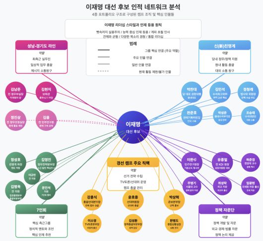 이재명 후보의 인적 네트워크는 성남시 시절을 거쳐 경기도, 국회에 이르는 동안 구축된 '4중 포트폴리오 구조'를 나타내고 있는 것으로 파악된다. 이 네트워크는 성남-경기도 라인, 신(新)친명계, 7인회, 정책 자문단으로 구성된 데에 경선 캠프 주요 직책진이 더해진 형태다. 각 그룹은 고유한 역할을 수행하면서도 상호 보완적 관계를 형성하고 있어 이재명 후보의 실용적 리더십 스타일을 반영하고 있다는 평가다.
