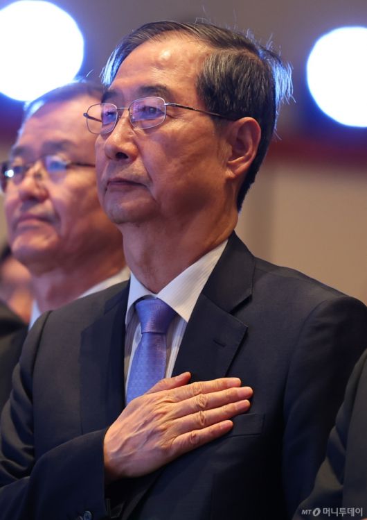 [서울=뉴시스] 최진석 기자 = 한덕수 대통령 권한대행 국무총리가 29일 서울 강남구 건설회관에서 열린 해외건설 1조달러 수주 및 60주년 기념식에서 국기에 경례하고 있다. 2025.04.29. myjs@newsis.com /사진=최진석 |